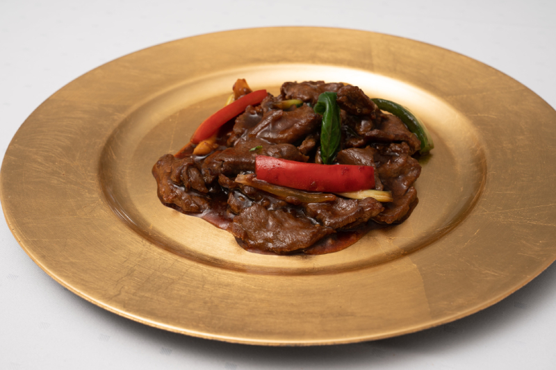 Bœuf aux poivrons légèrement relevé et basilic.
