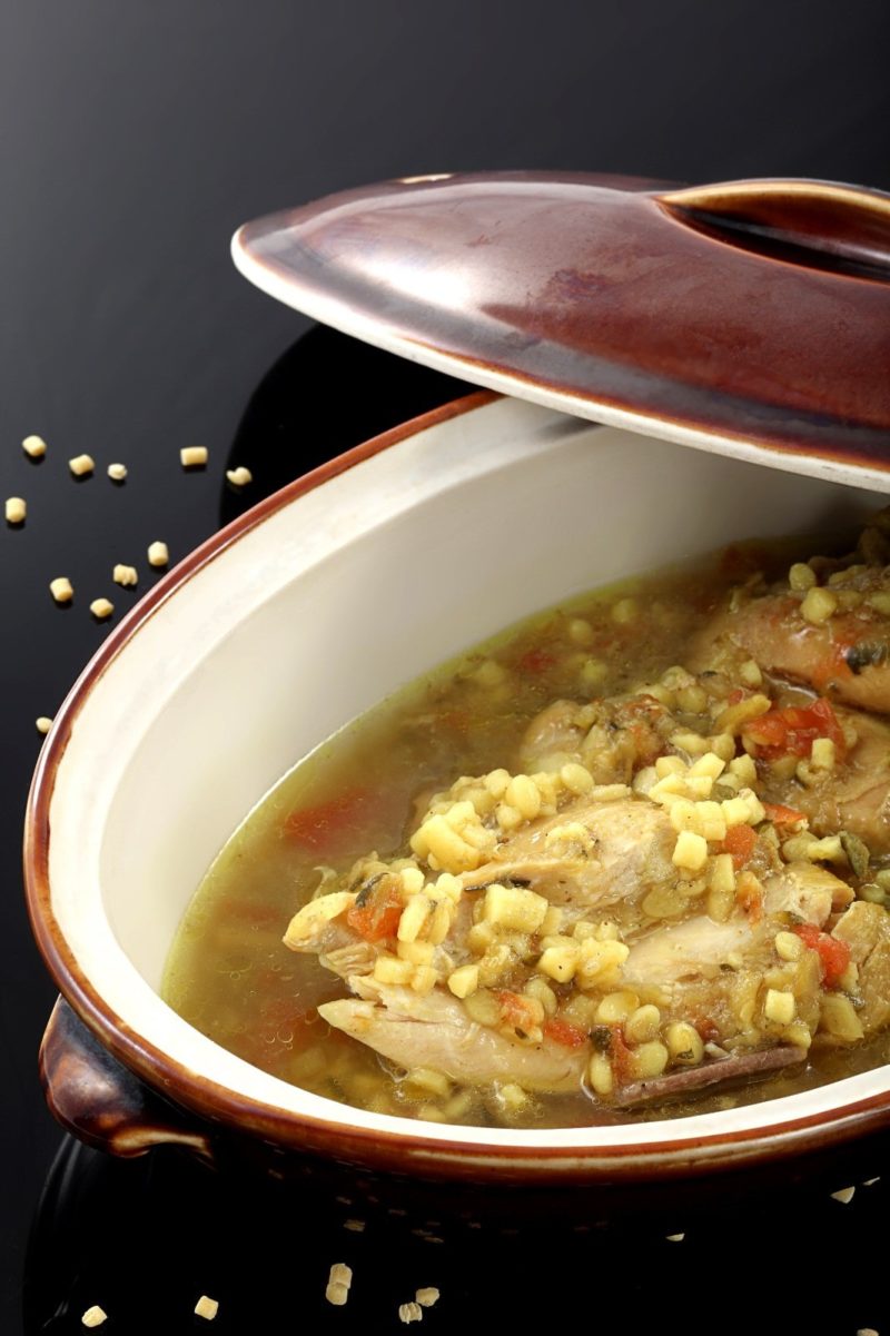 Petites pâtes de blé, bouillon de volaille, mijoté de céleri, cuisse de poulet accompagné de semoule.