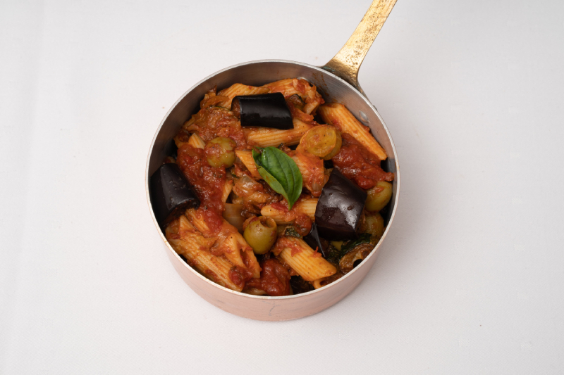 Penne sauce tomate, ail, aubergine, olive, basilic. Livraison à domicile Retrait en boutique